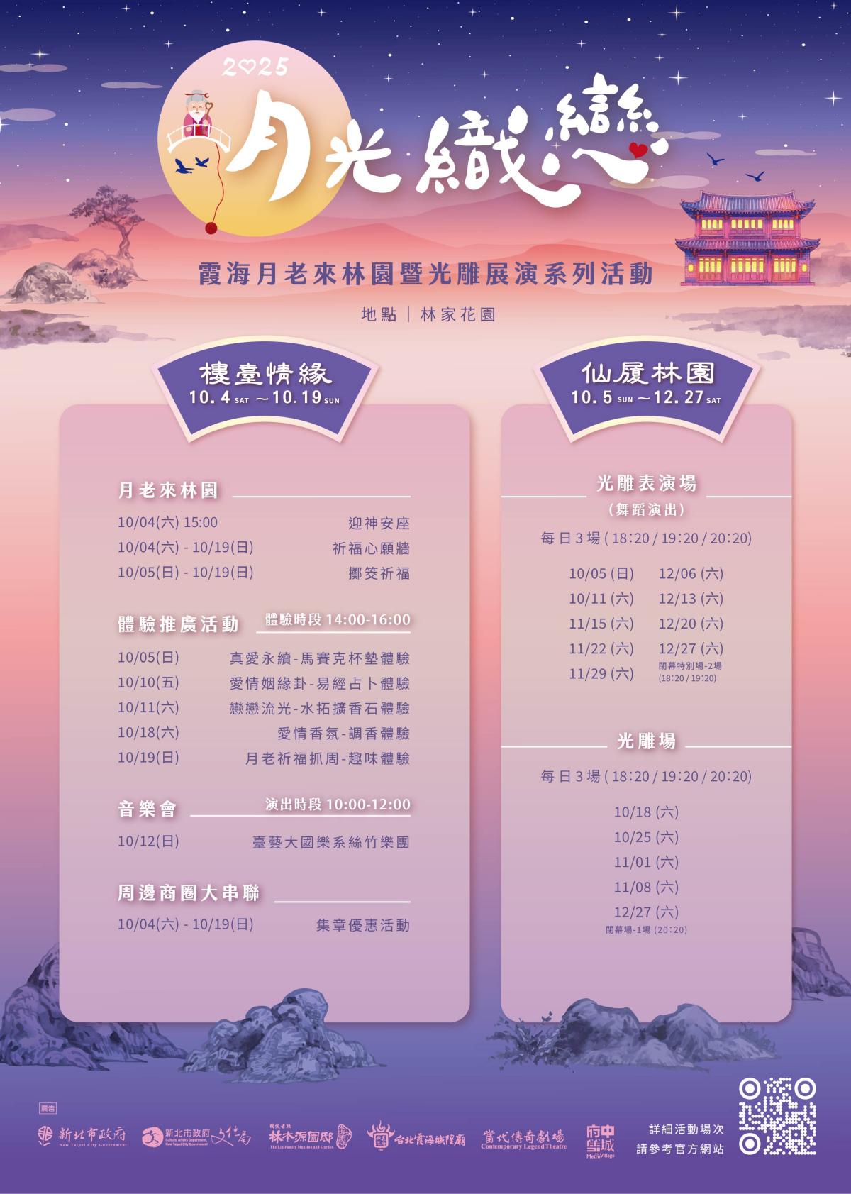 《月光織戀 仙履林園》夜間光雕嘉年華自10月5日至12月27日登場,每週六晚間6點至9點連演三場,共13夜39場,其中26場由當代傳奇劇場跨界舞蹈演出。活動以牛郎織女傳說結合古蹟光影,打造奇幻愛戀之旅,並推出「愛之願」互動體驗,觀眾可即時將手機圖像投影於古蹟,留下專屬祈願印記。